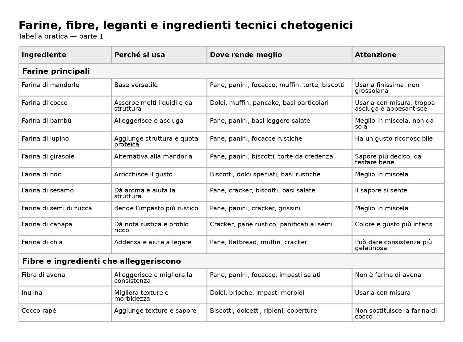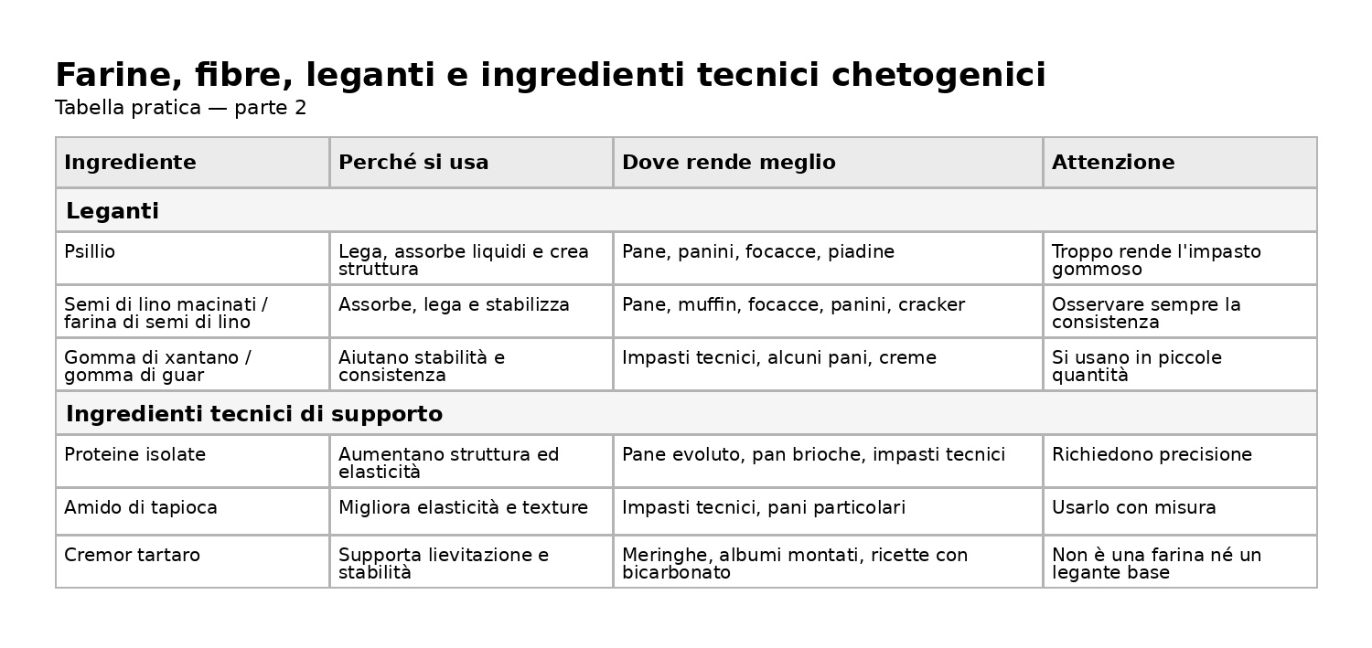 Per aiutarti a orientarti meglio tra farine, fibre, leganti e ingredienti tecnici chetogenici, qui sotto trovi due tabelle pratiche di riepilogo.