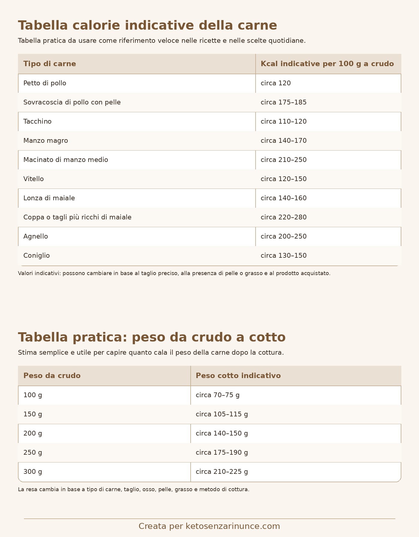 Scarica qui il PDF con 2 tabelle in 1: calorie della carne e peso da crudo a cotto, pratico da consultare e comodo da conservare.👇