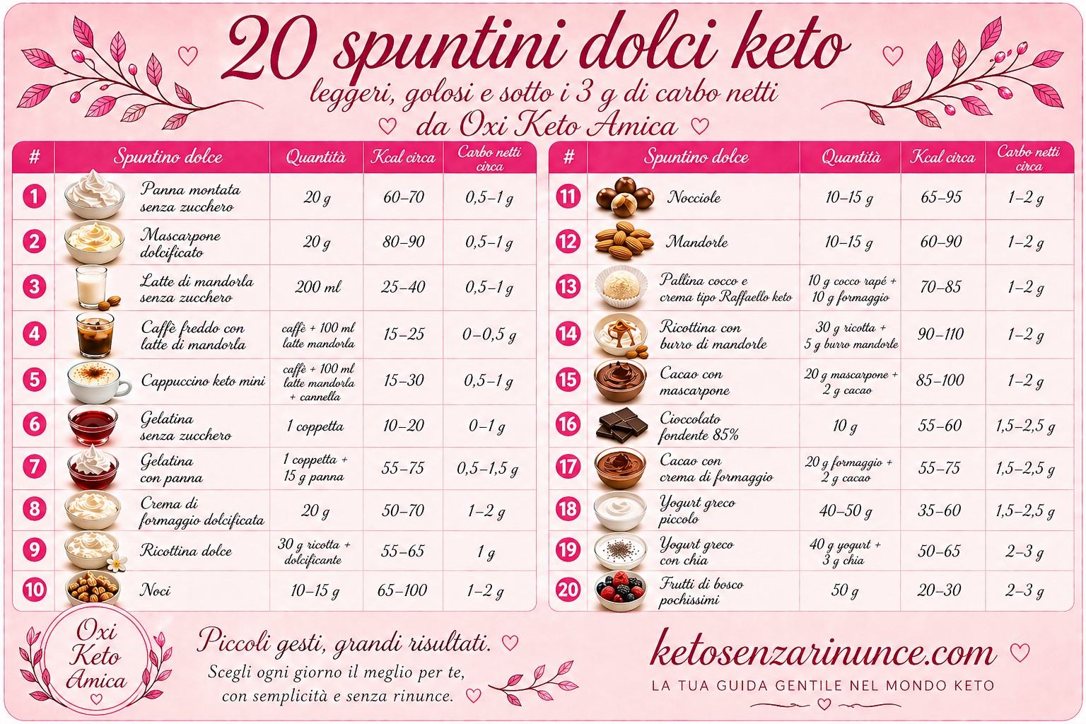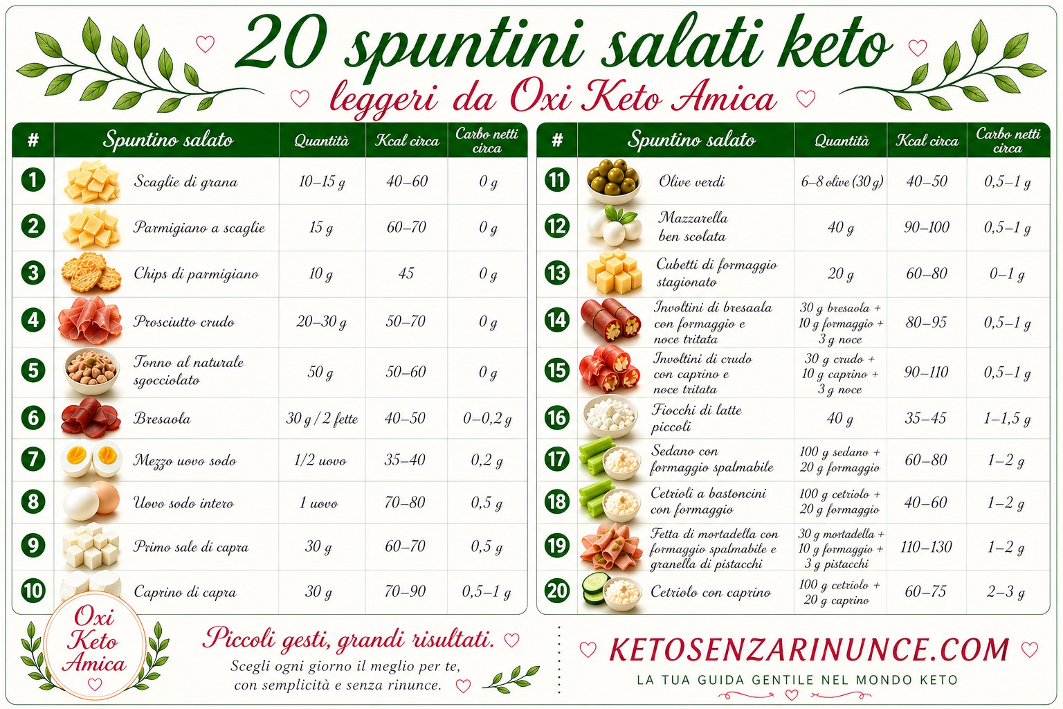 Per questo ho preparato queste due tabelle dedicate agli spuntini keto leggeri: una con idee salate e una con idee dolci, pensate per chi segue un’alimentazione chetogenica o low carb e vuole restare più facilmente sotto controllo con calorie e carboidrati.